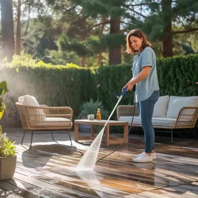 Timber decking: Wood requires pressure control — too much force risks raising the grain or damaging a finish. The JetHose's adjustable spray patterns make it suitable for timber surfaces, including deck prep before staining or painting. Reviewers recommend testing a small area first.